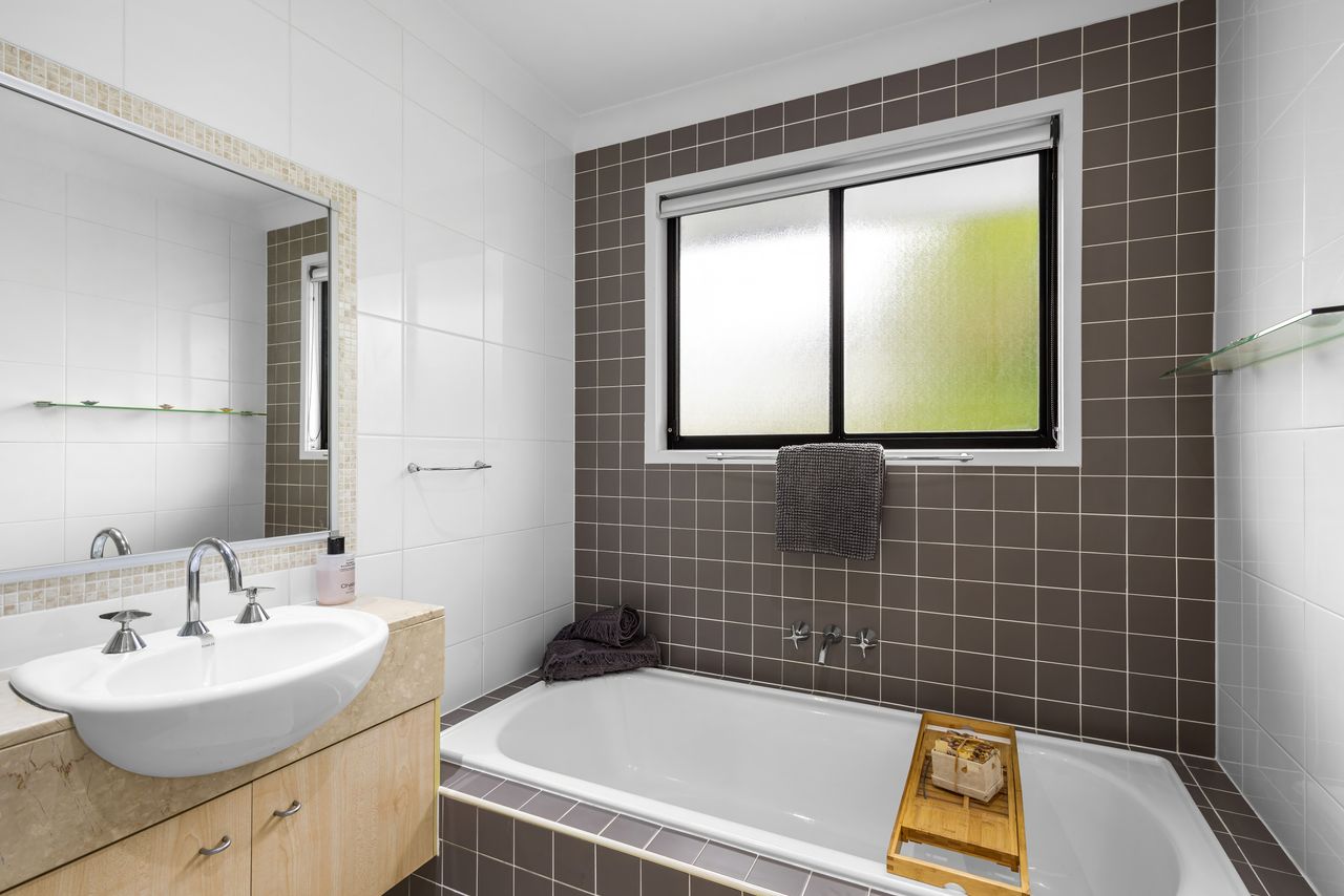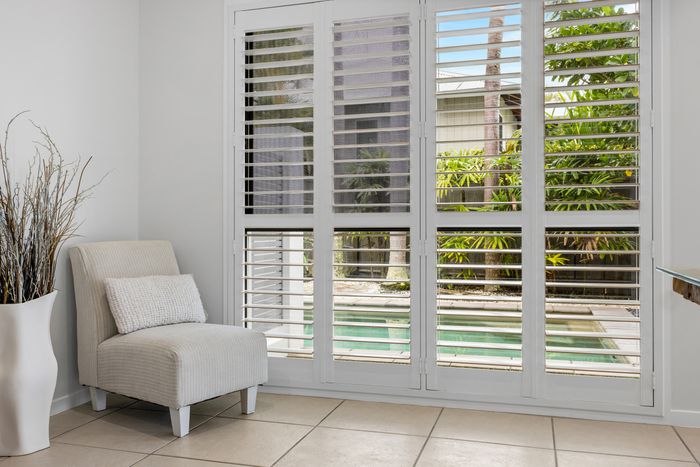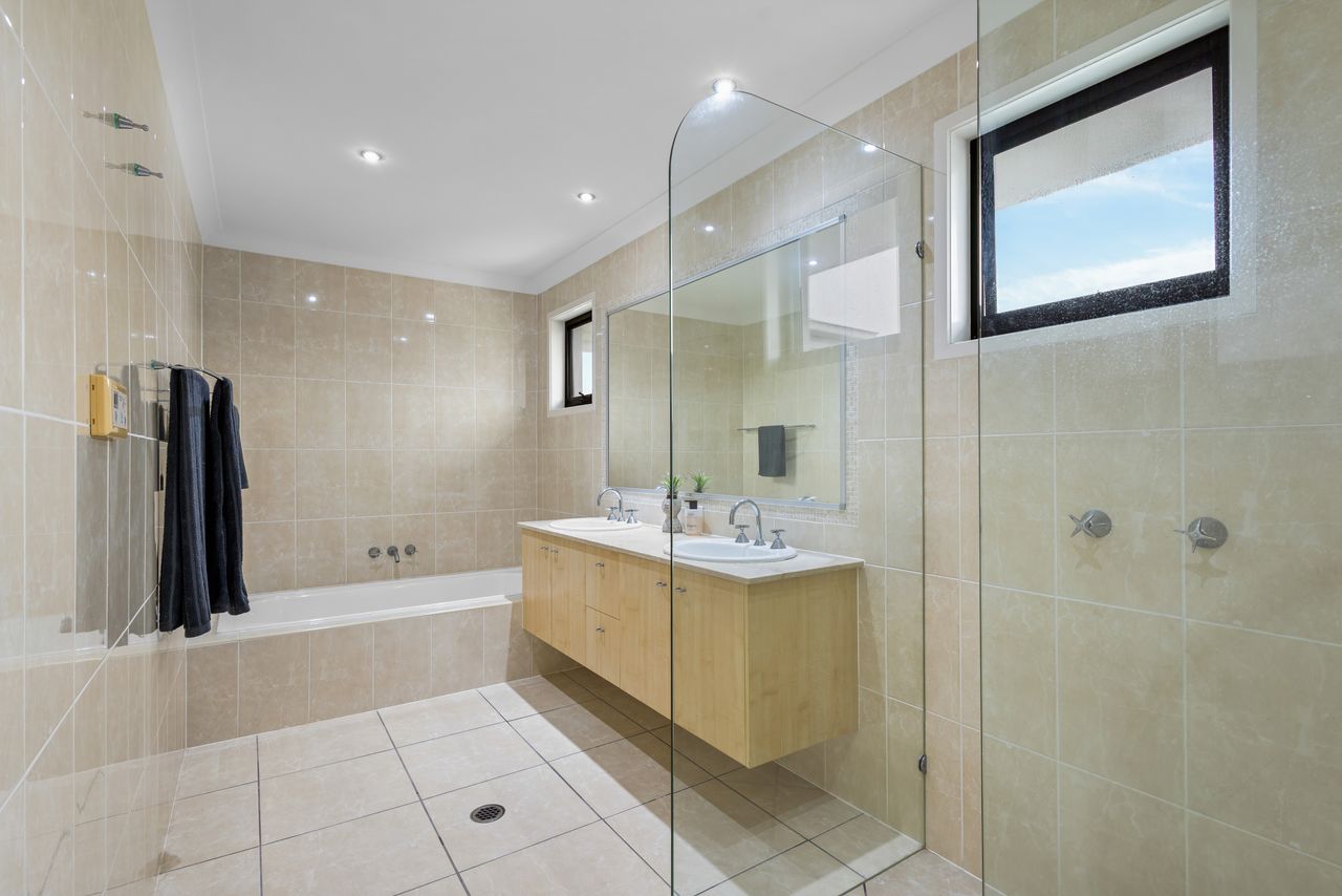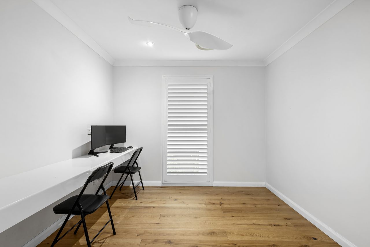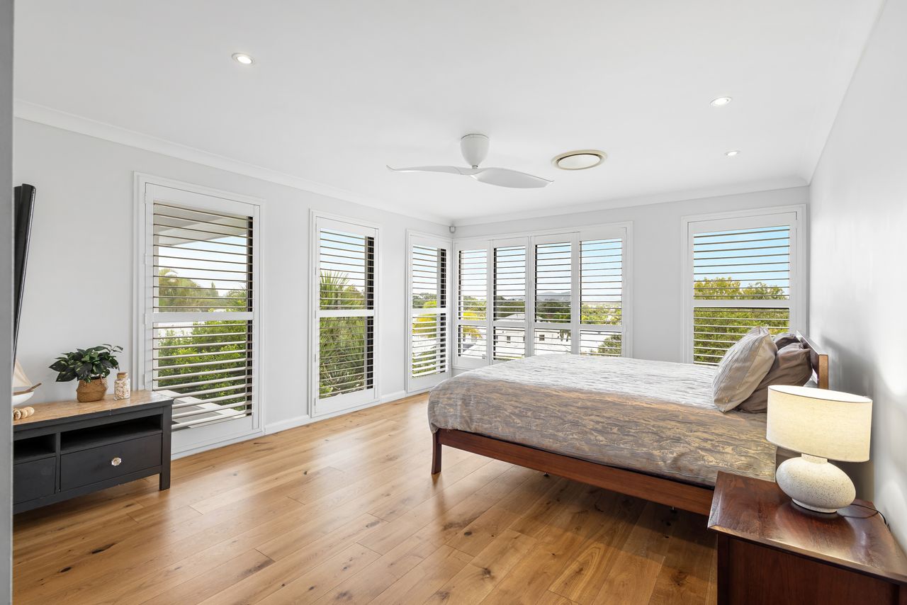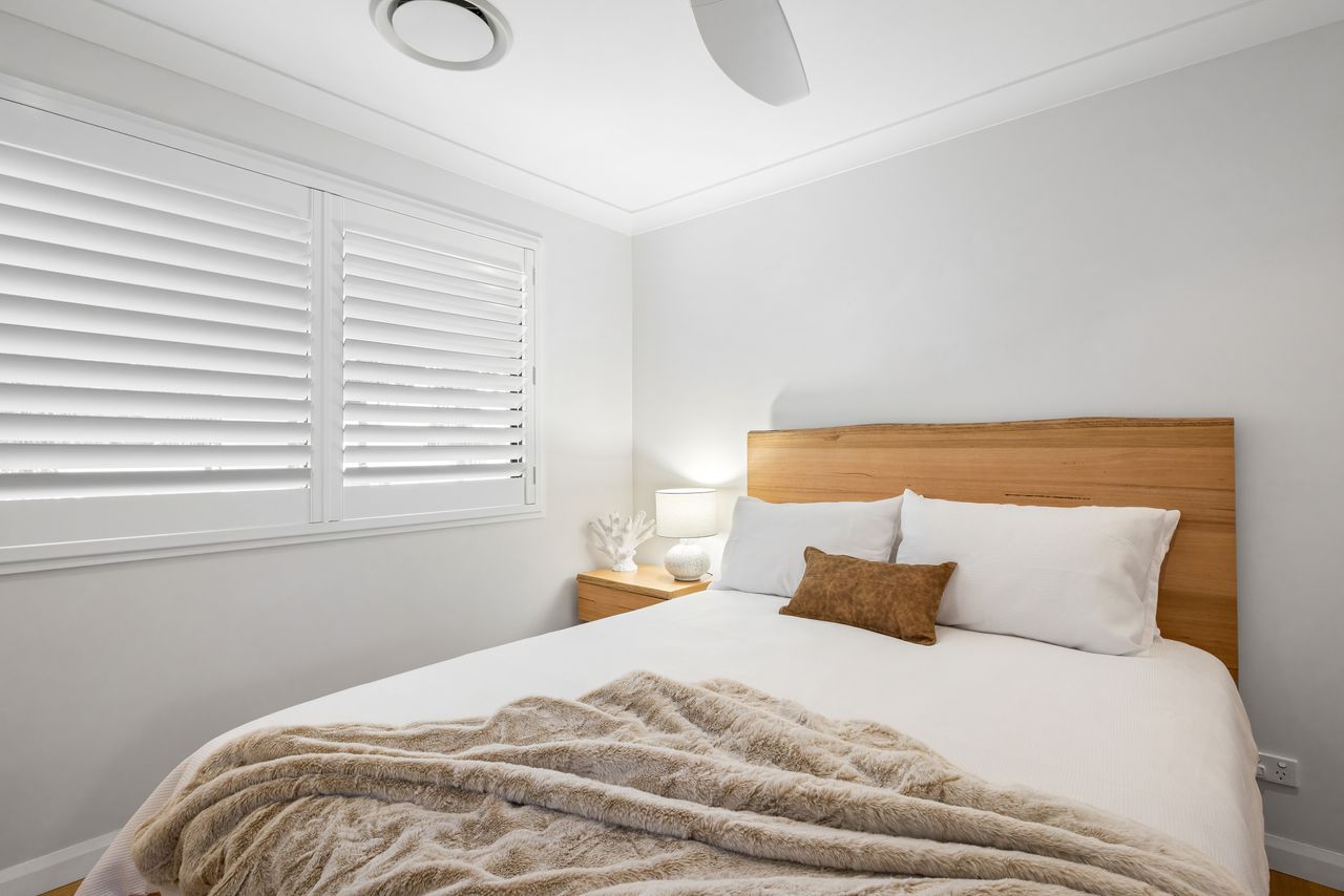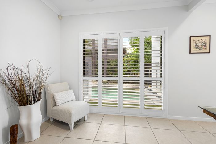 Upstairs, the master suite is a sanctuary of its own, featuring timber-finish floors, plantation shutters, and uninterrupted views of Noosa Heads. A luxurious ensuite, walk-in robe, and an additional study or nursery complete this private retreat. Across the atrium walkway, two generous bedrooms with built-in robes share a beautifully appointed bathroom, offering space and comfort for your stay.