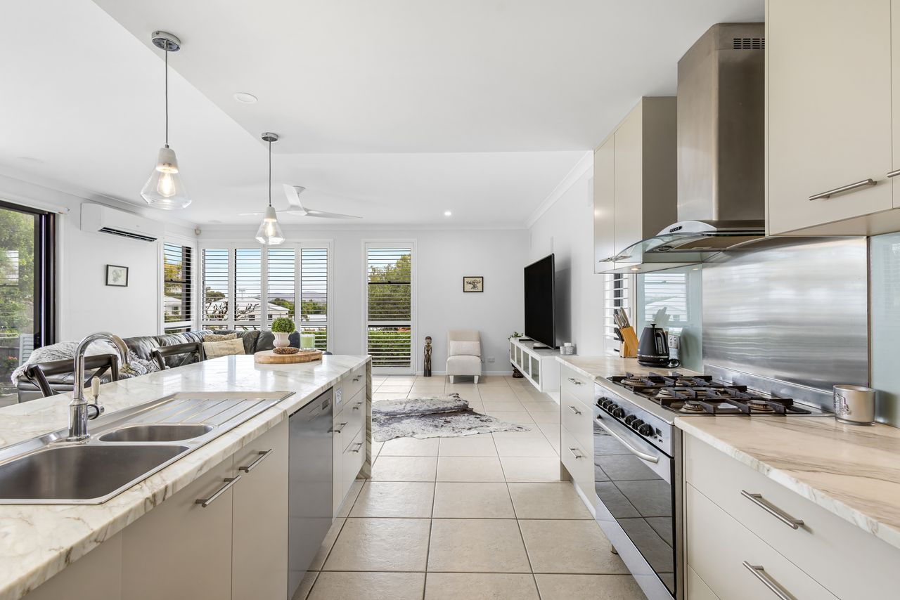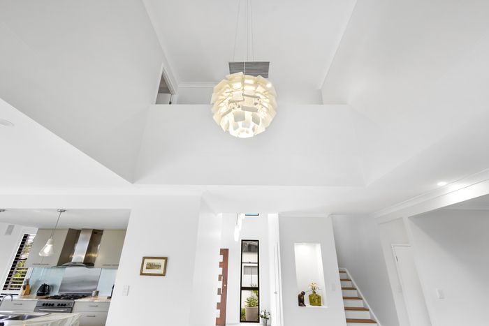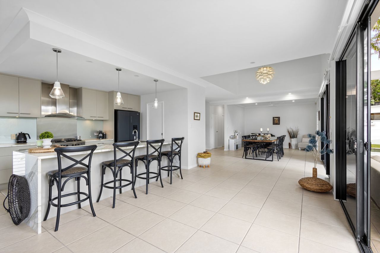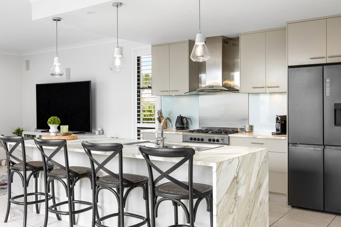 Step inside and be welcomed by an expansive open-plan living, lounge, and dining area, where floor-to-ceiling windows invite in natural light and frame the lush greenery beyond. The modern kitchen, complete with a marble waterfall benchtop and stylish pendant lighting, is the heart of the home—perfectly positioned to bring people together.
