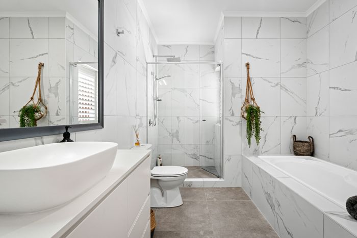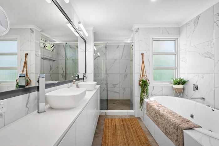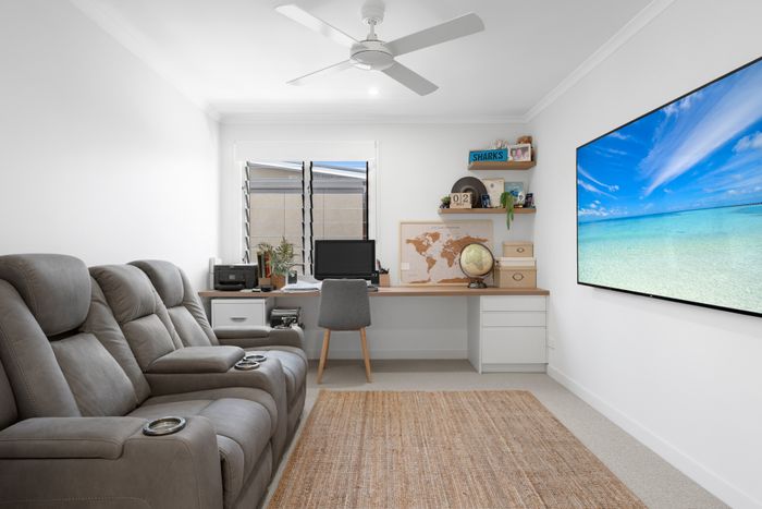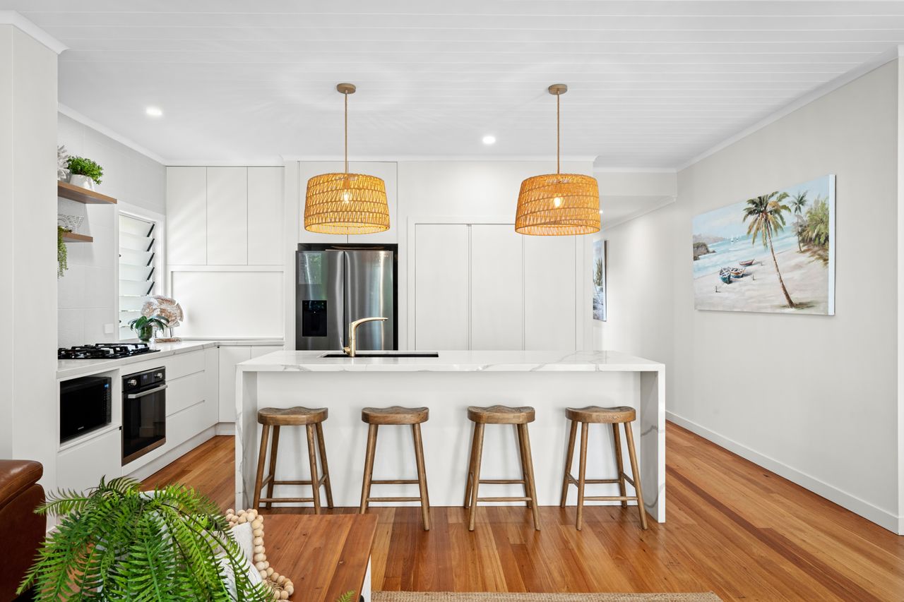 The designer kitchen is a chef’s delight, featuring sleek stone benchtops, a spacious island, and top-quality appliances — ideal for everything from leisurely brunches to gourmet seafood feasts made with the freshest local produce.