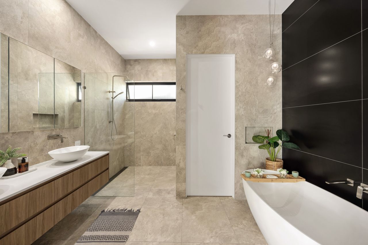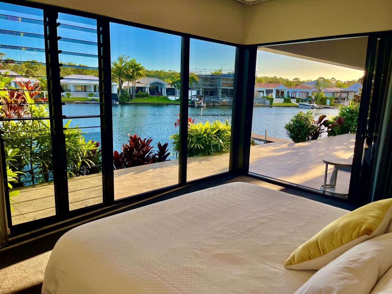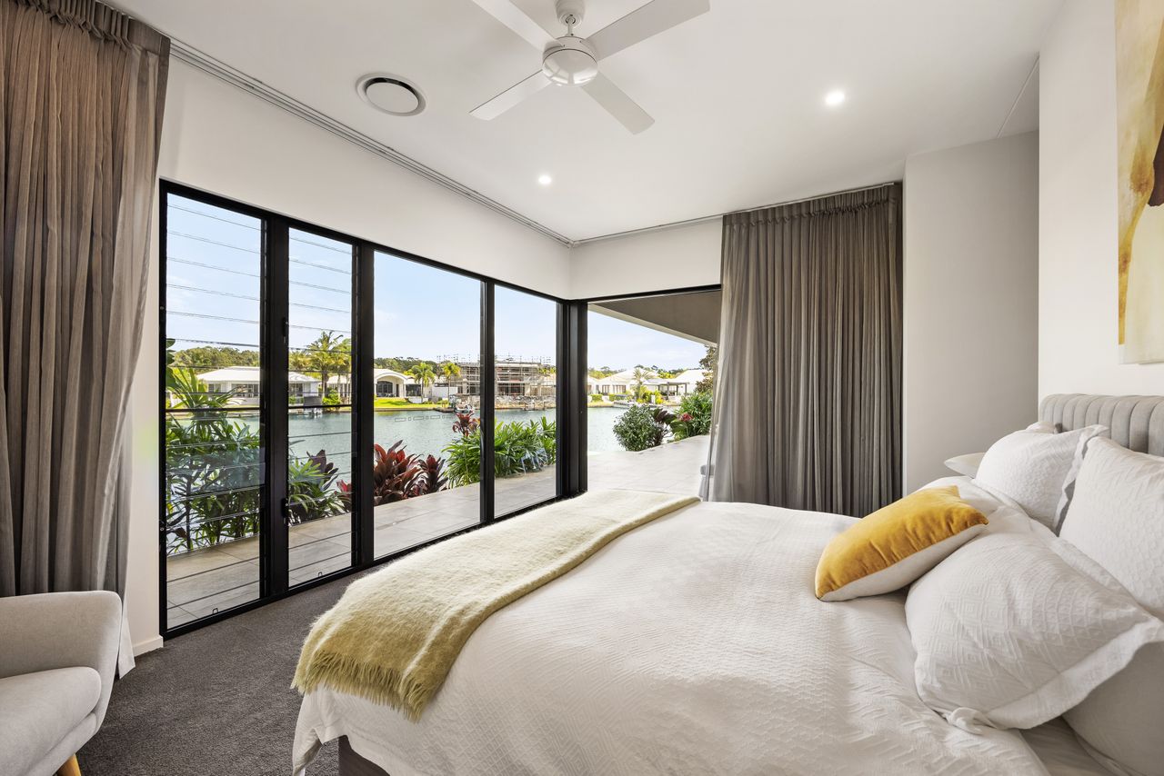 • Master One overlooks the canal with sliding doors to the alfresco area. It features a king-sized bed, lounge chair, walk-in wardrobe, and an opulent ensuite with a shower, twin vanities, freestanding bath, and a separate smart toilet and hand basin.