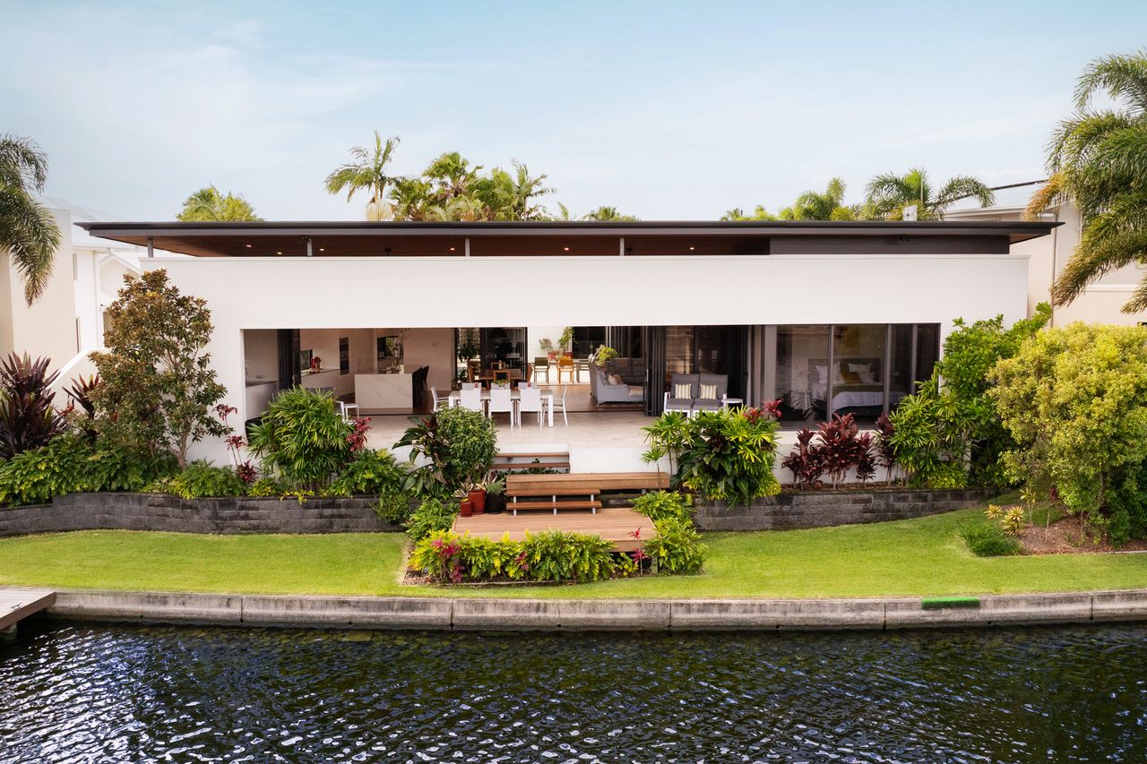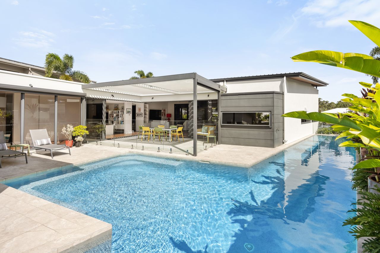 2 Indulge in the ultimate Noosa escape at this spectacular, ultra-modern 4-bedroom, 3-bathroom waterfront residence with large 26 meter wide waterfront. Thoughtfully designed with elegance and comfort in mind, this home effortlessly accommodates up to eight guests and features a breathtaking 20-metre solar-heated lap pool—perfect for a truly indulgent holiday.