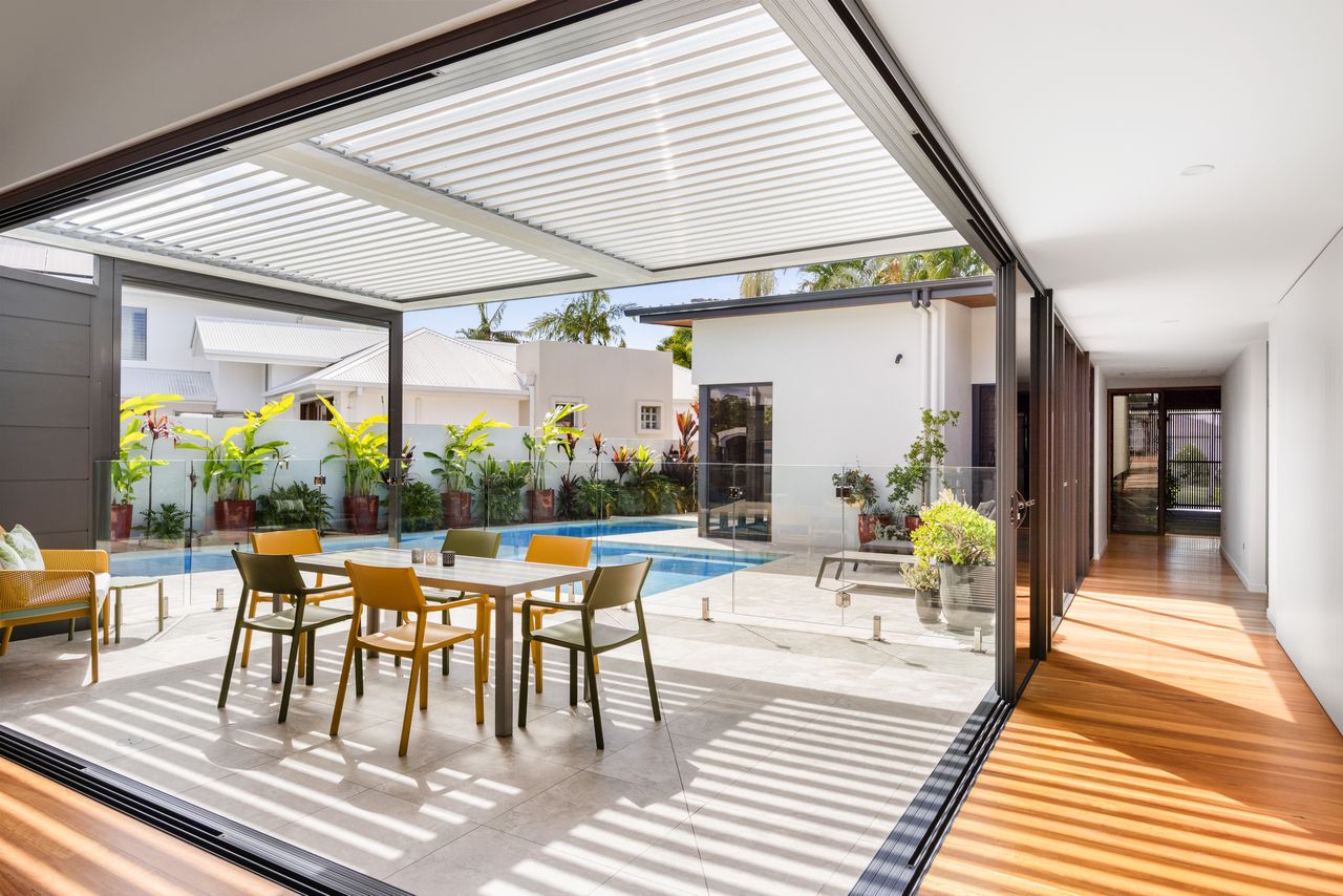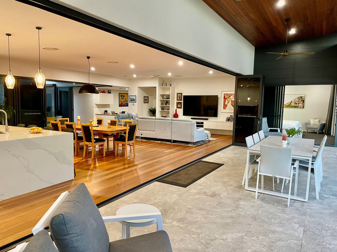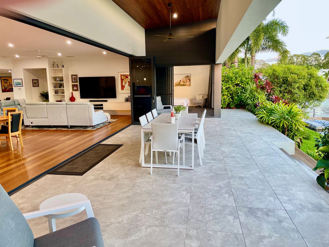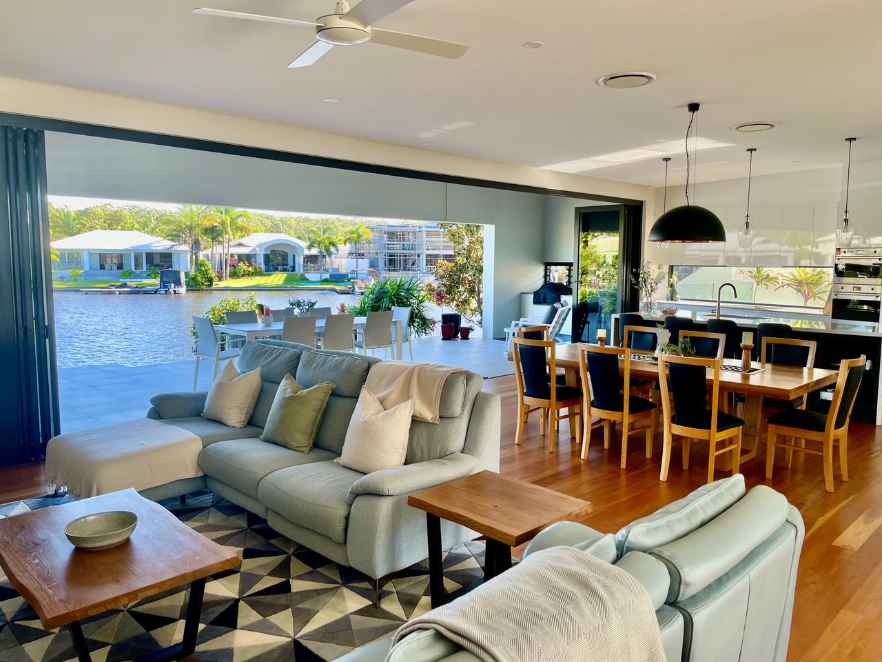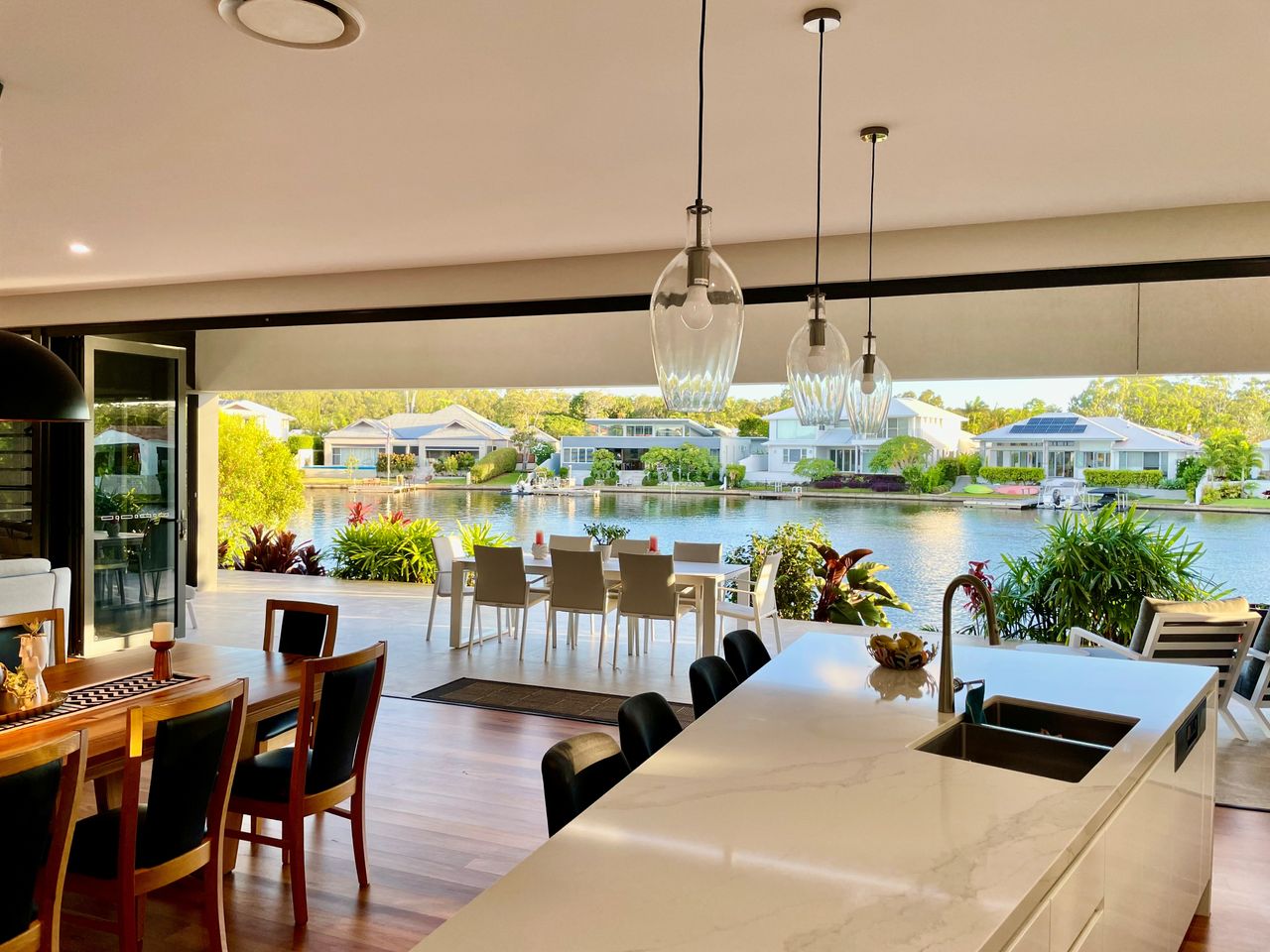 On one side, 12-metre bifold doors create a dramatic opening to an impressive undercover alfresco space overlooking the canal, complete with a custom-built outdoor kitchen, Weber BBQ, and an 8-seater dining table surrounded by luxurious loungers. On the opposite side, huge sliding doors open to another covered entertaining area beside the 20-metre lap pool, equipped with a 6-seater table, lounge chairs, and sun loungers for complete poolside enjoyment. Centrally positioned, the main dining table comfortably seats eight.