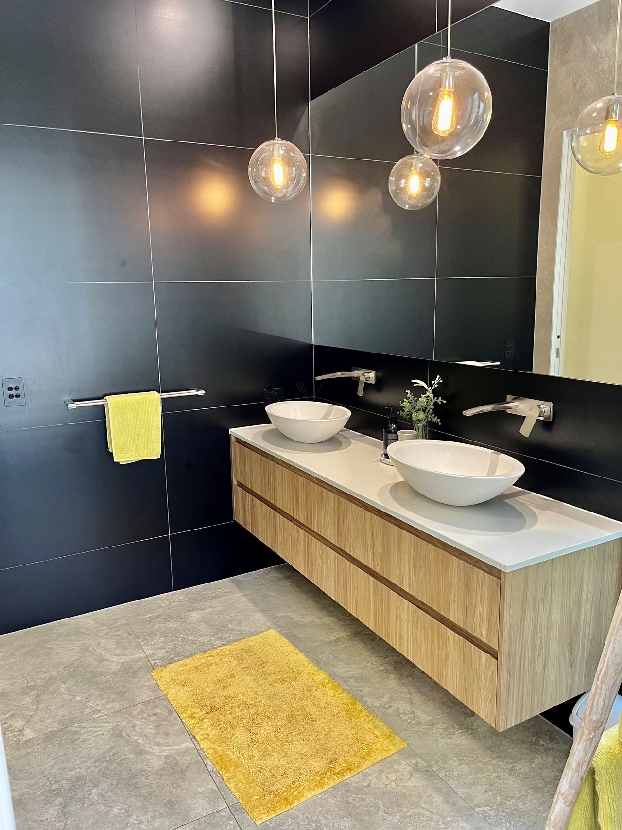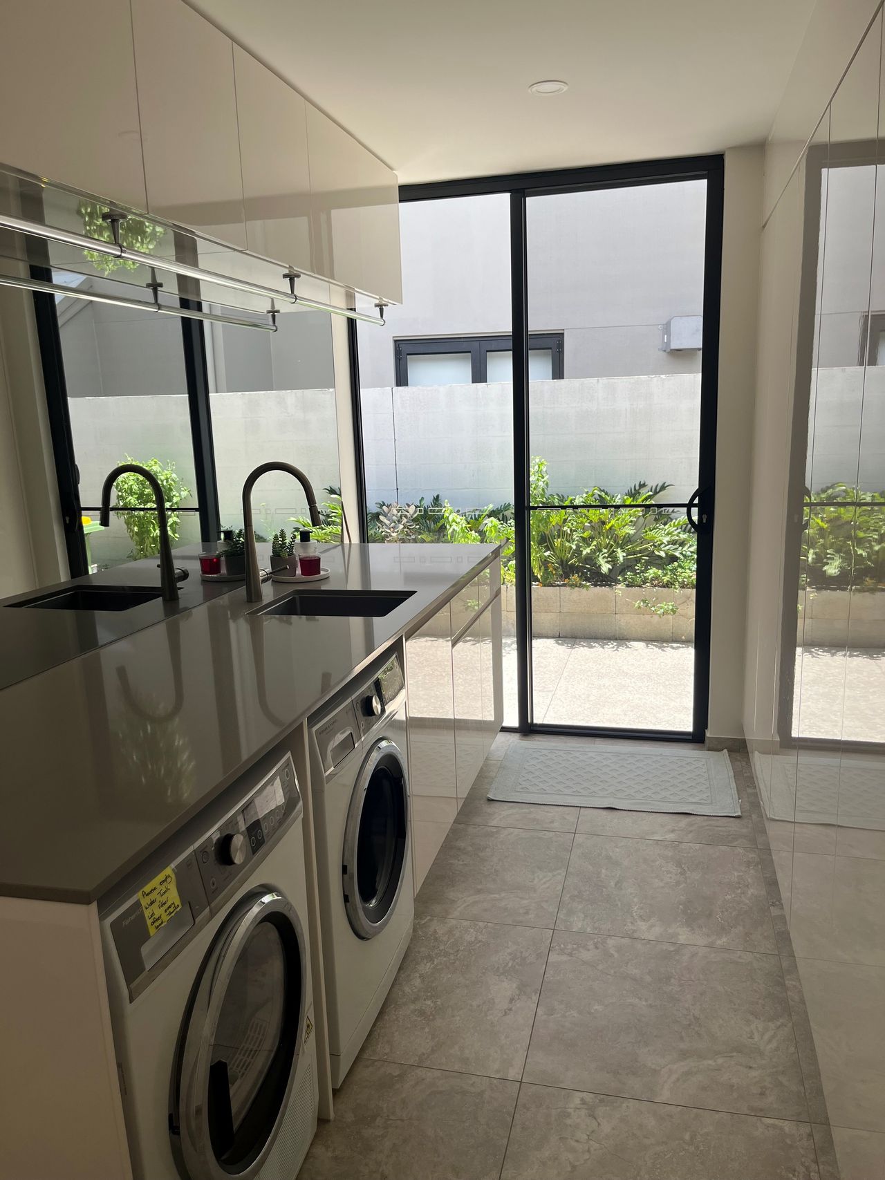 • Oversized laundry with front-loading washing machine, condenser dryer, sink, extensive bench space, and outdoor clothesline access