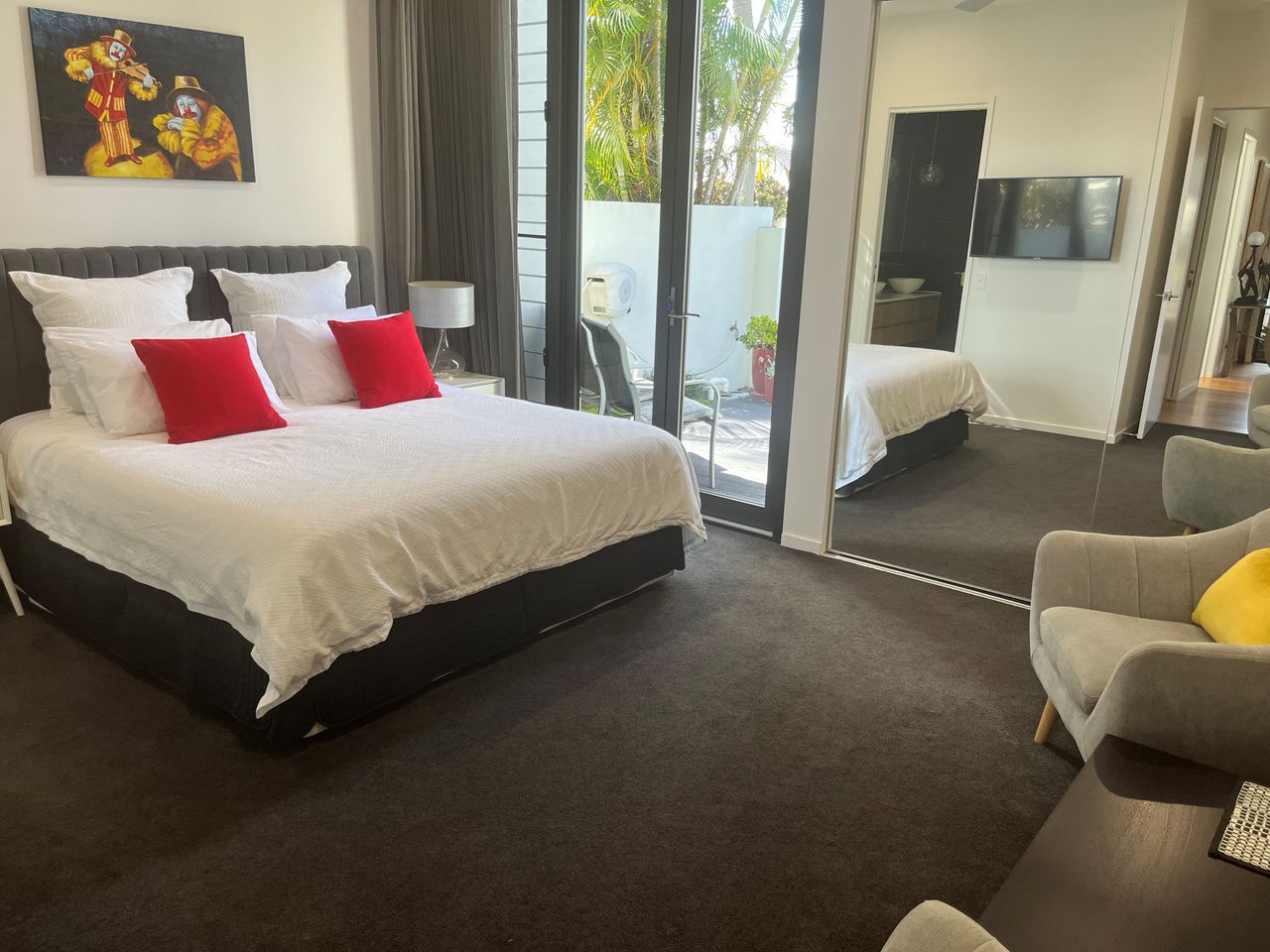 • Master Two, at the opposite end of the home, includes a king bed, lounge area with two chairs, 43-inch smart TV, mirrored wardrobe, ensuite with twin vanities and shower, plus a private deck with French doors.