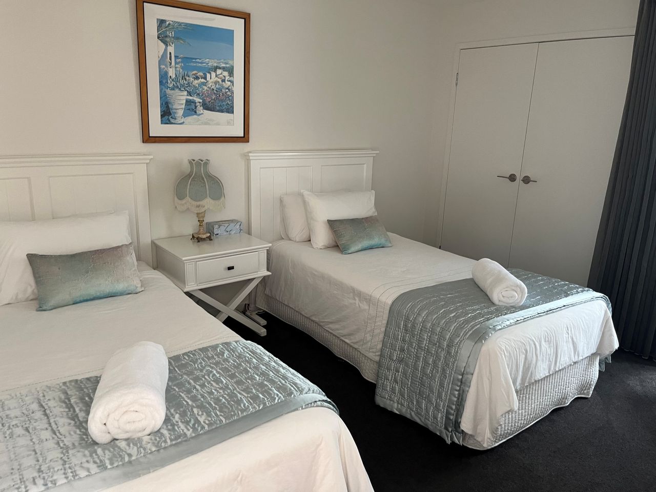The third bedroom offers direct pool access with a queen bed, lounge chair, and generous wardrobe, while the fourth bedroom features twin king single beds with ample storage. The main bathroom includes a shower and single vanity, with a separate toilet and hand basin.
