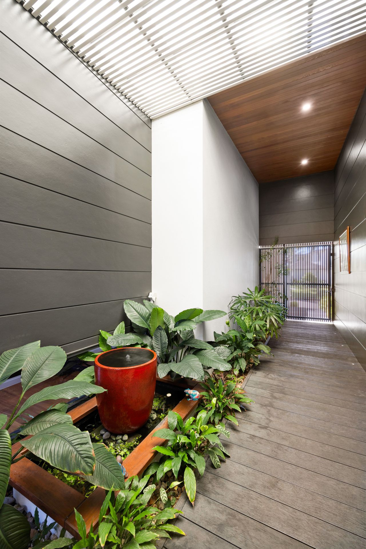 • Coded front gate leading to a serene undercover walkway with garden, goldfish pond, and water feature
