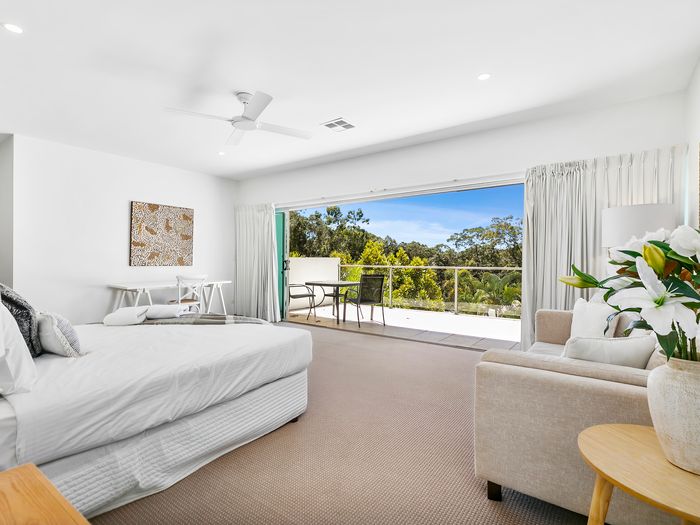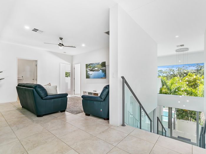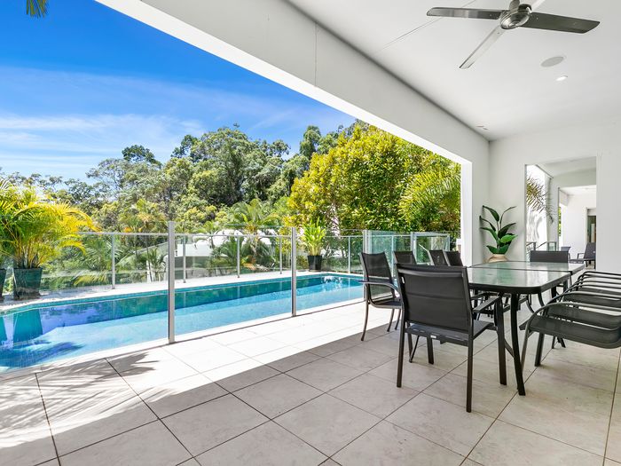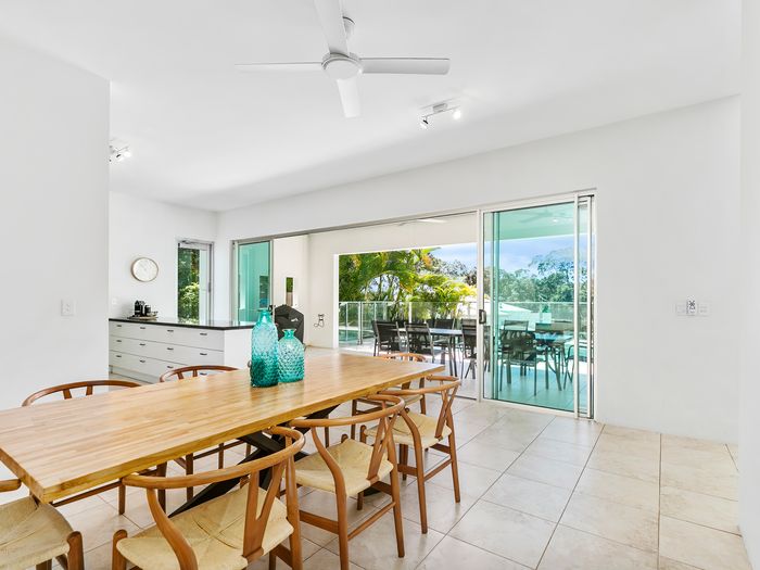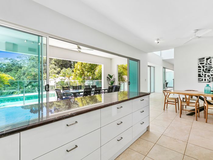 The modern entertainer's kitchen seamlessly opens onto the poolside balcony, providing an expansive and inviting space. Here, you can revel in relaxation while enjoying breathtaking views of the Noosa National Park, which borders the property.