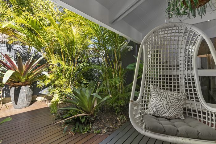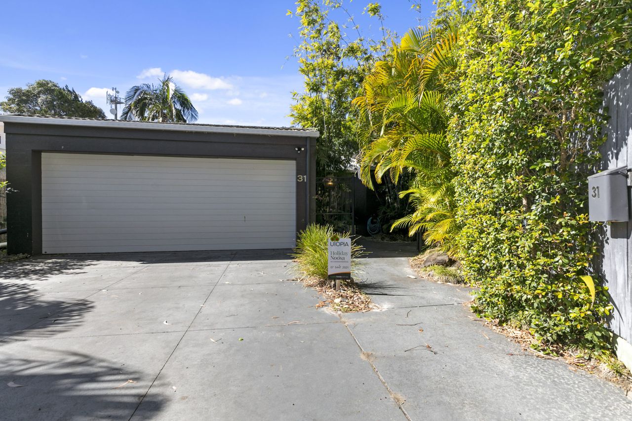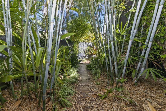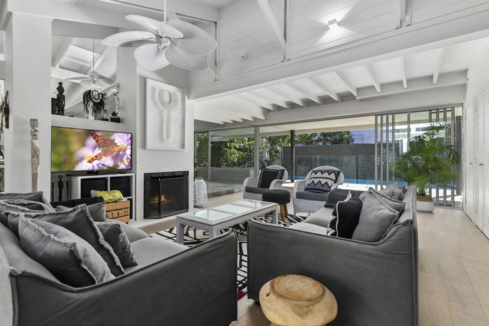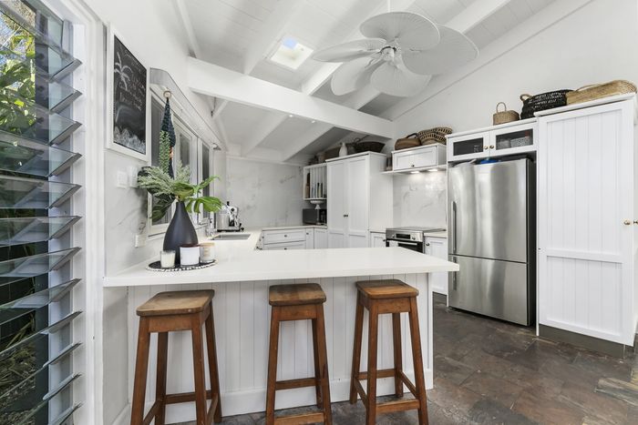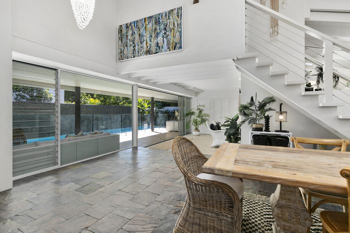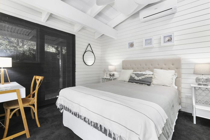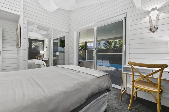 This fabulous open plan holiday home has great character and style . The home is unique in design and has a beautiful feel when you walk in the front door. Tucked away from the street ensuring exceptional privacy yet when you are inside the home it is open, light and relaxing, you could be anywhere. Recently renovated and meticulously maintained, with white cedar high raked ceilings and highlight windows illuminating your entire surrounds. All bedrooms are freshly presented in white, and elegantly styled. An additional advantage is the separate fourth bedroom which is a beach style studio/guest house with its own ensuite, kitchenette and private courtyard. With the open plan living area revealing natural stone flooring, the sunken lounge opens on both sides with full length glass doors to either an extensive covered alfresco space overlooking the exquisite pool with an amazing slate wall water feature and landscaped gardens or a relaxing tropical garden peace of paradise that backs onto Noosa National Park. The location is on Noosa Hill with a back gate access to the Noosa National Park. You can walk to Hastings street in ten minutes or walk to Sunshine Beach in half an hour, Everything is at your door step. The main house sleeps 6 guests; there are 3 bedrooms, two queen rooms and master with ensuite plus a room with twin beds.