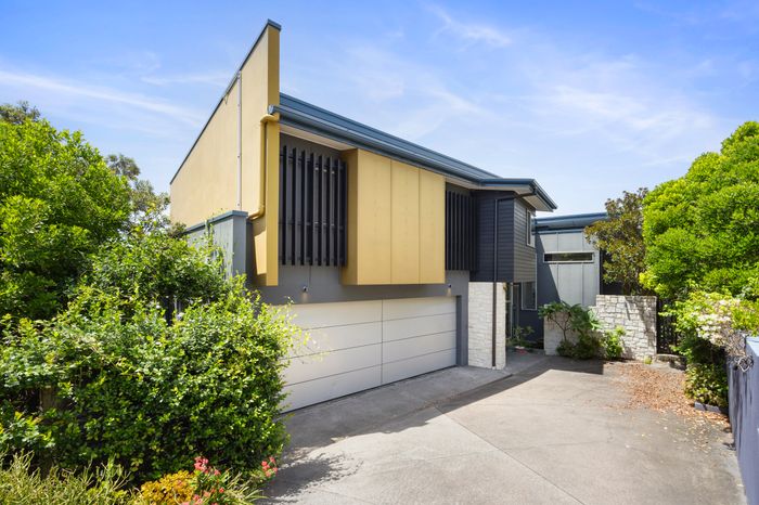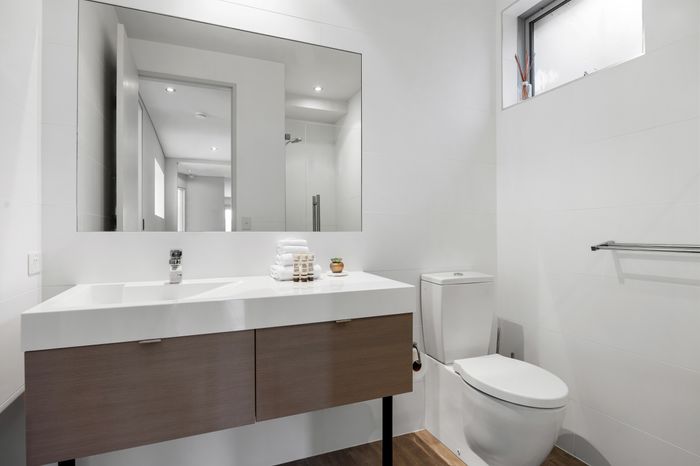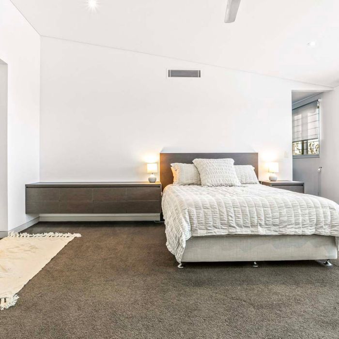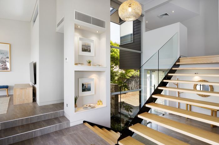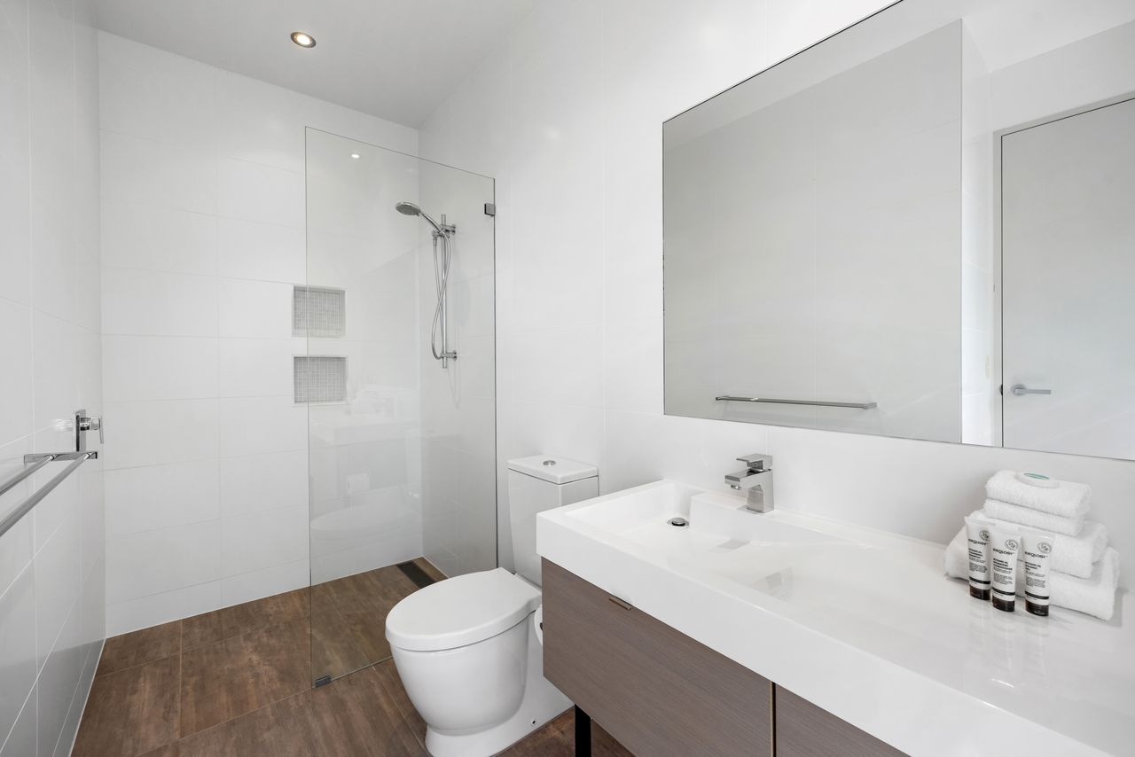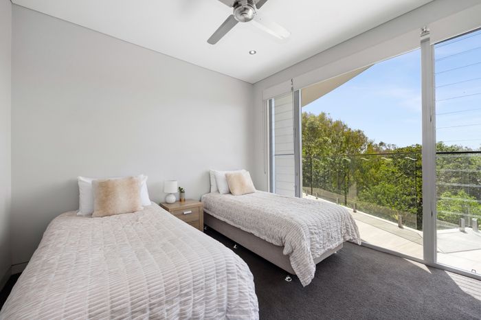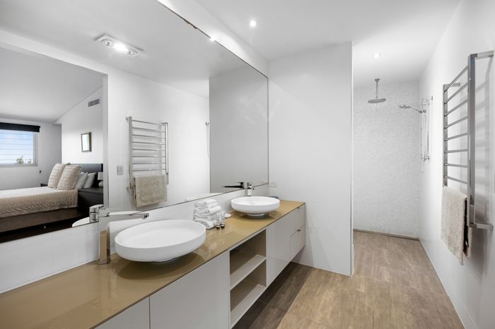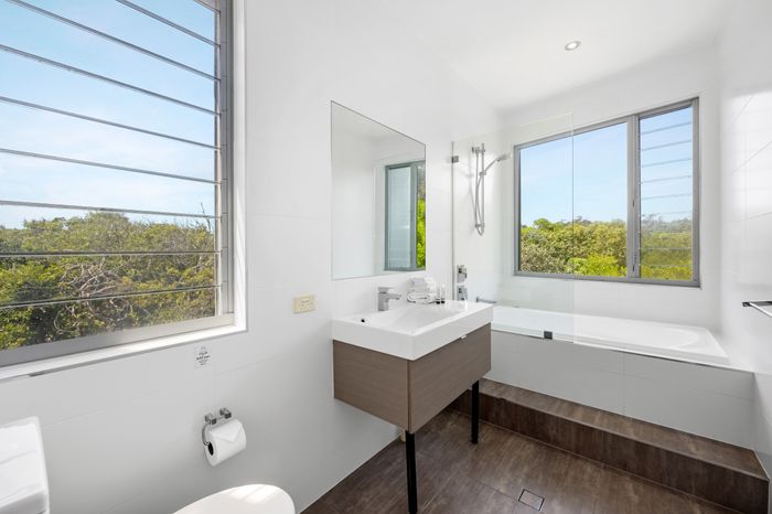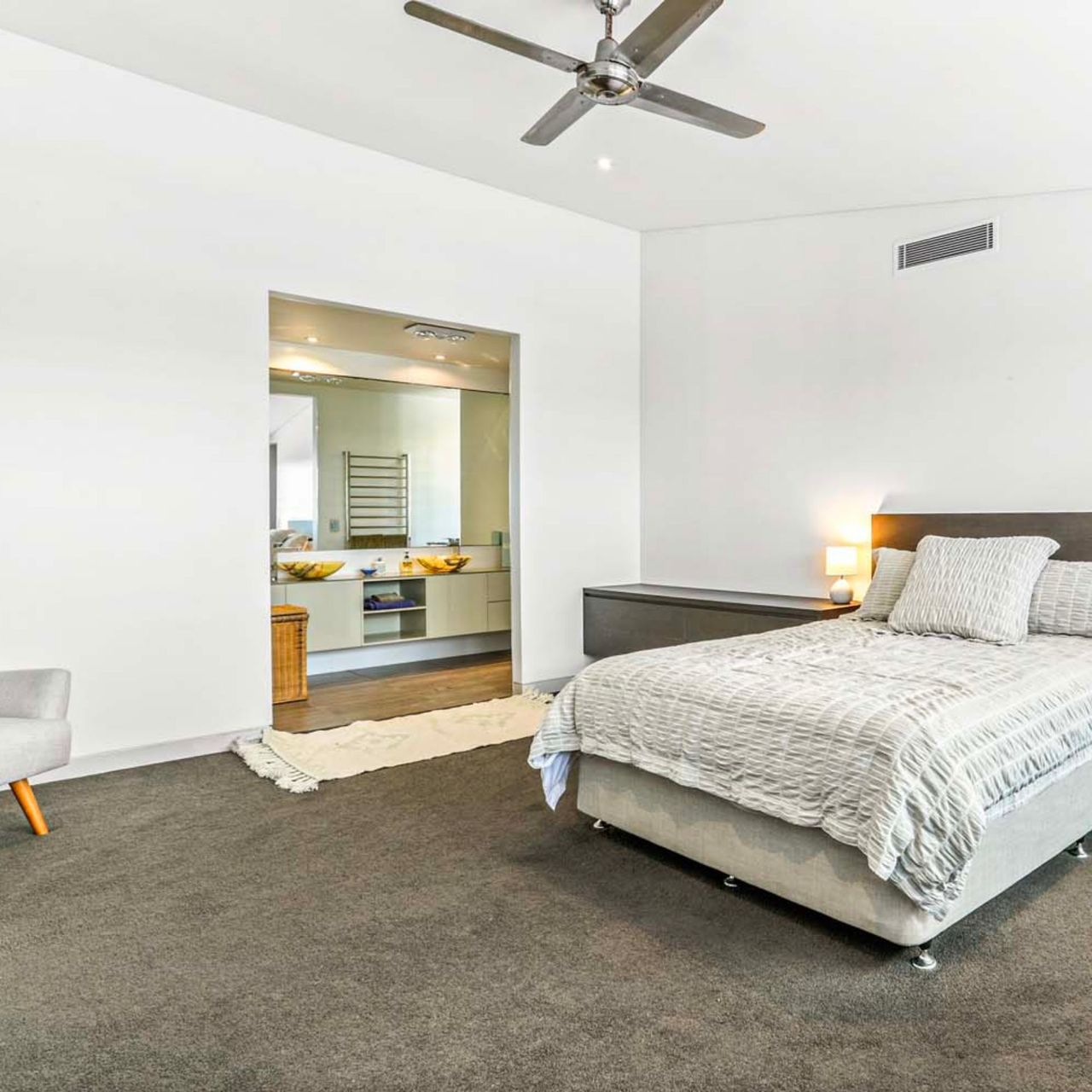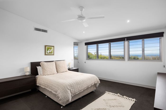 A short ascent leads to the plush carpeted top level, where the impressive main bedroom awaits. With its high ceilings, louvres, and stunning ocean views, it offers a serene retreat complete with a luxurious ensuite featuring double vanities and a walk-in shower.