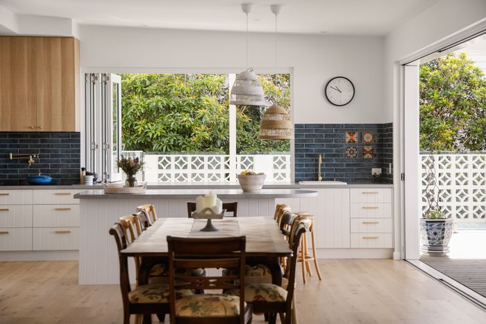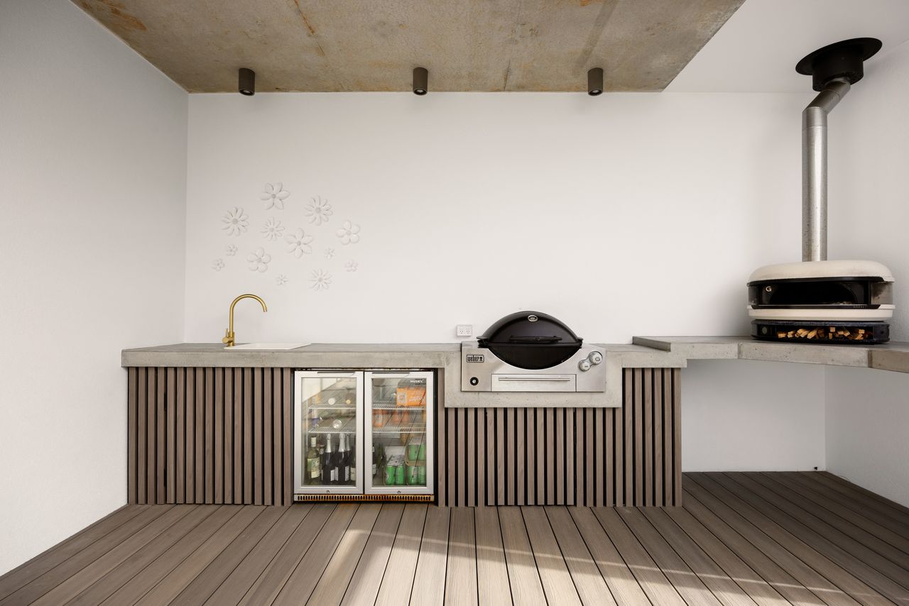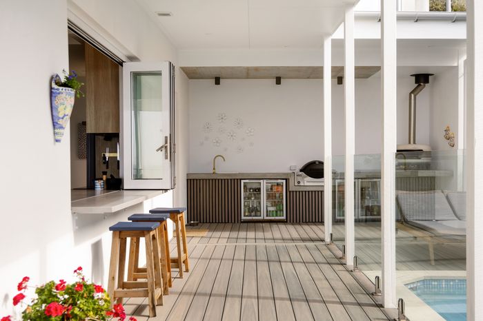 With four generous bedrooms and three modern bathrooms, the home comfortably accommodates families or groups. The sun-drenched open-plan living areas connect effortlessly to outdoor entertaining zones, which include a fully equipped outdoor kitchen with a BBQ, pizza oven, sink, and fridges—ideal for lazy summer afternoons with friends and family.