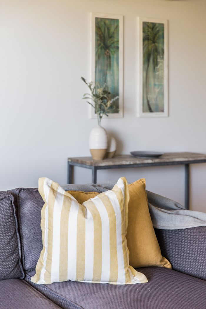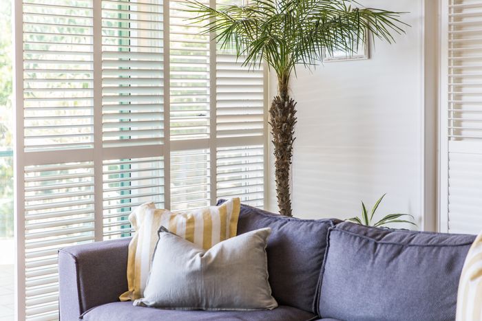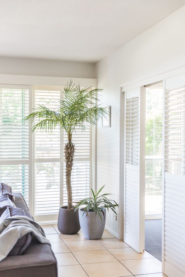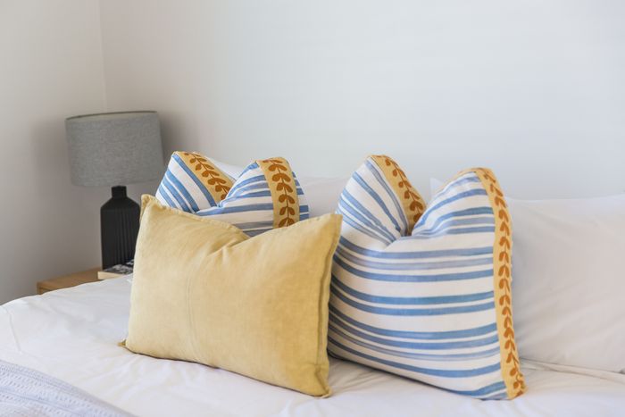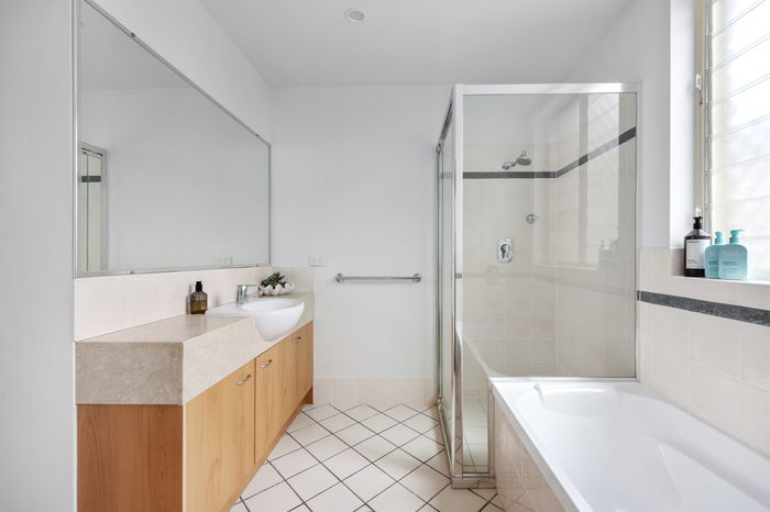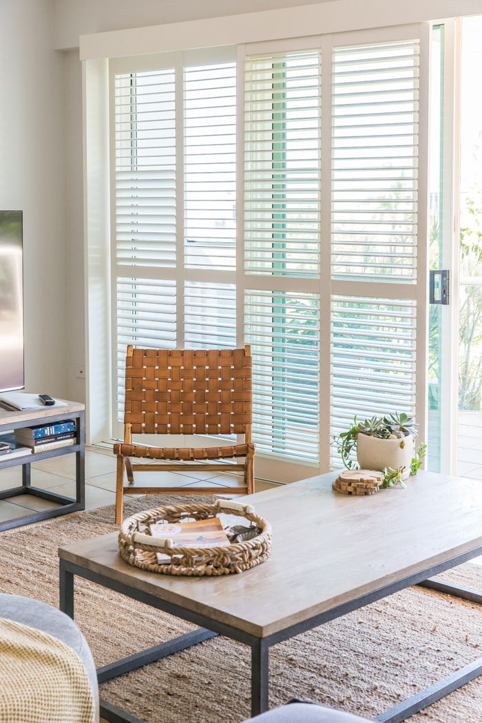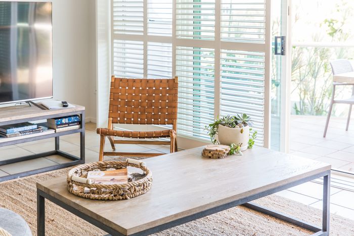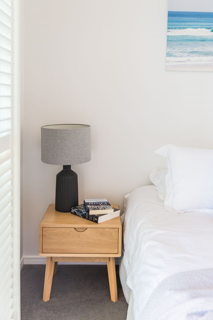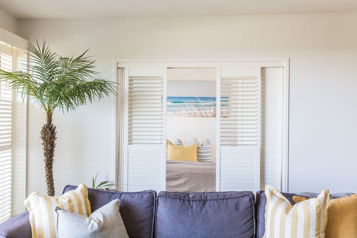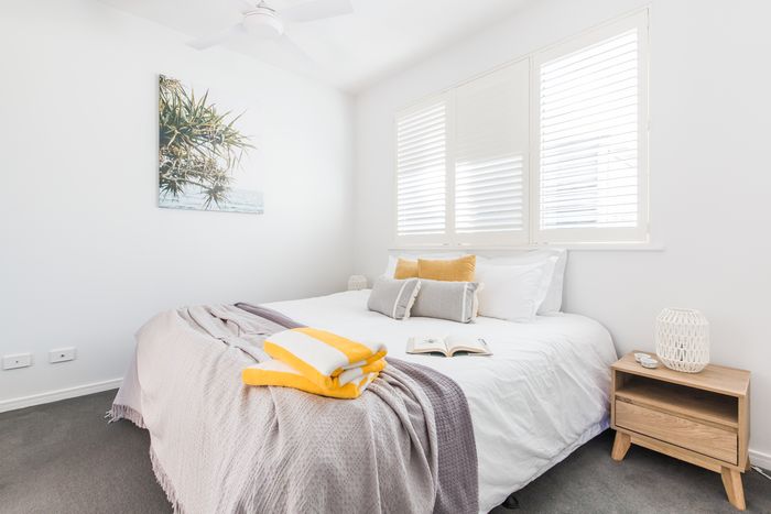 The master suite exudes a light and airy feel, featuring white shutters, a plush king-sized bed, walk-in robe, and private bathroom. The guest bedroom offers versatility, with the option to configure as either a king bed or two king singles, making it suitable for couples, singles, or children.
