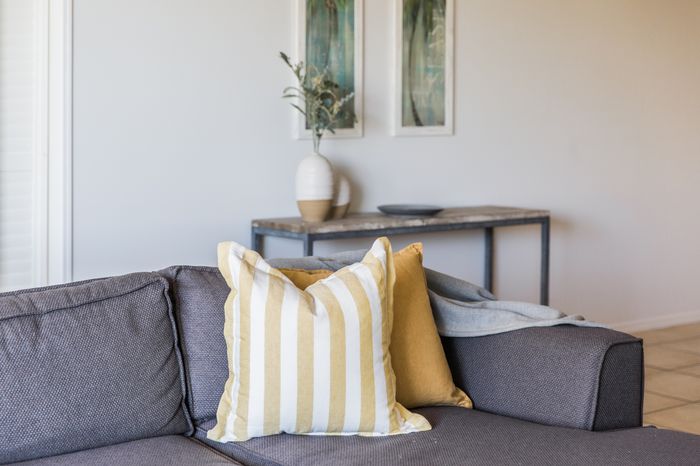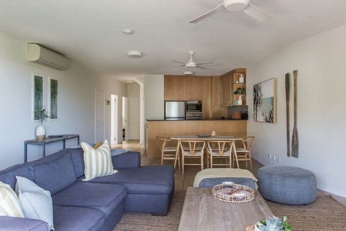 The open-plan kitchen is fully equipped for holiday cooking adventures, while the air-conditioned living area and ceiling fans throughout ensure comfort year-round. A laundry with washing machine and dryer adds convenience to your stay.