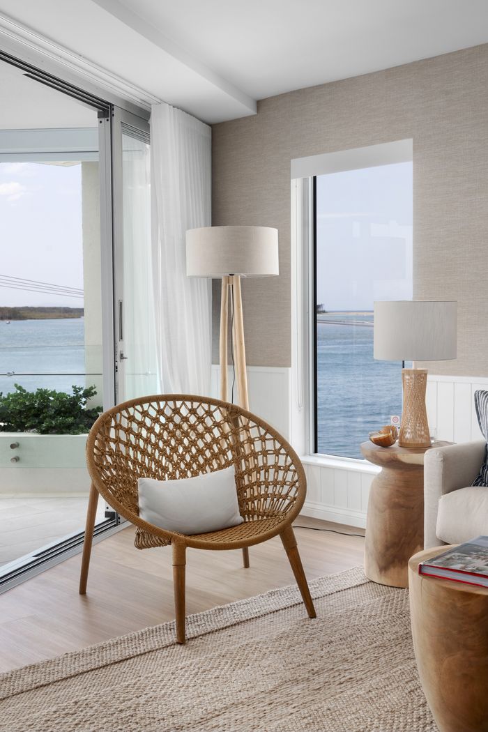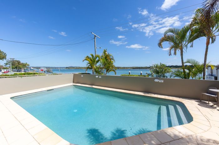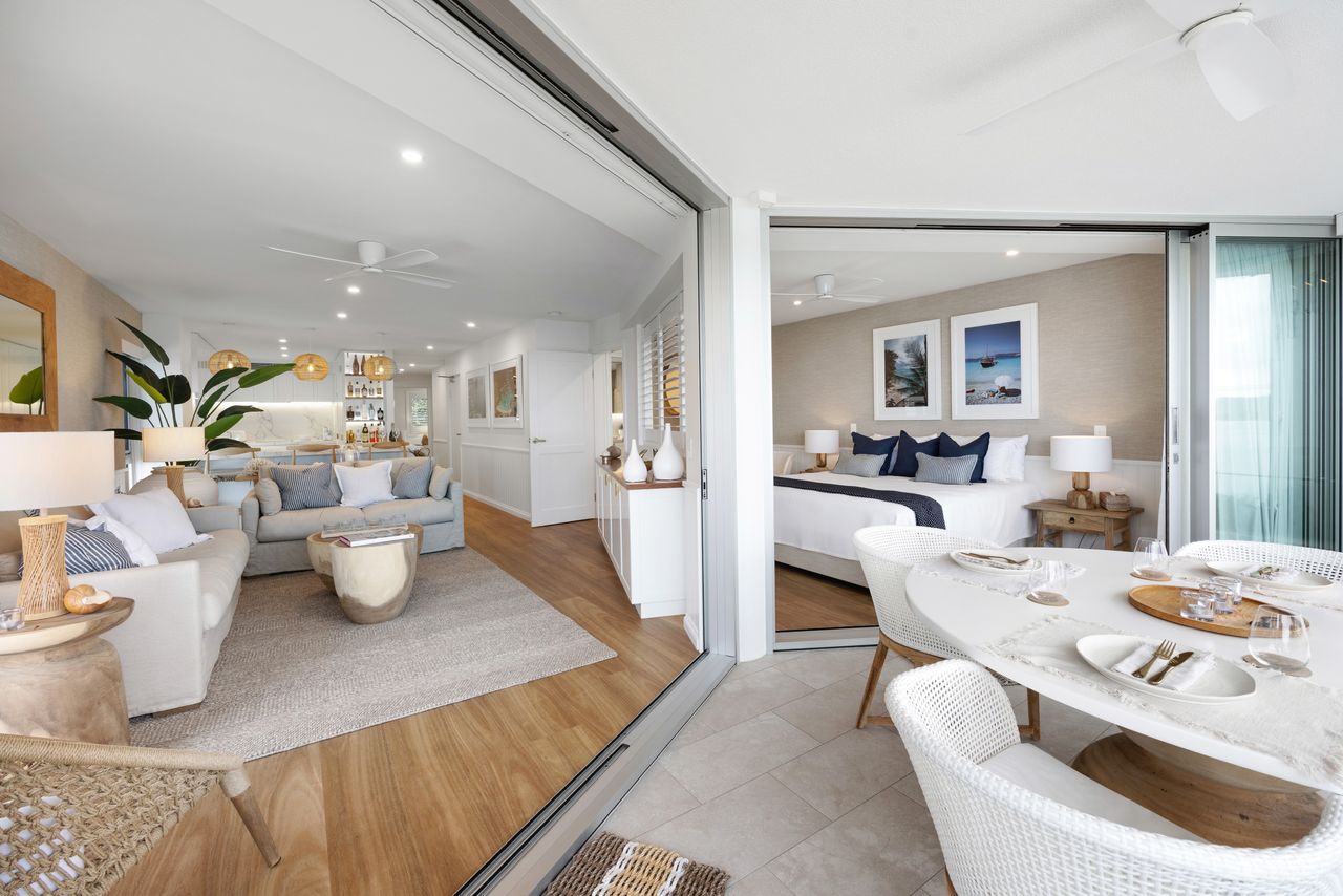 The modern kitchen is well-equipped with ample bench and storage space. The open-plan living area oozes cosmopolitan coastal style, with sumptuous lounges perfect for relaxing at the end of the day. From here step out onto the balcony which directly overlooks the river and shared pool. The living area has a quality pop up TV for your enjoyment.