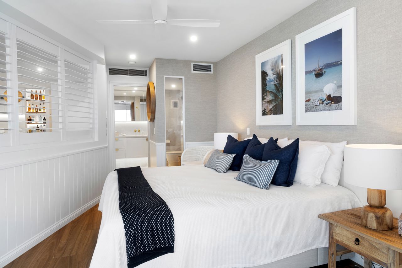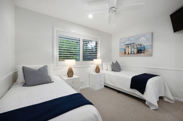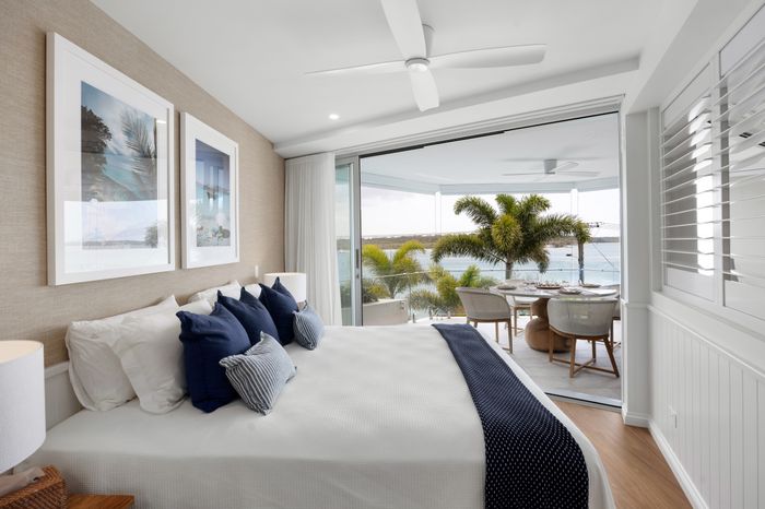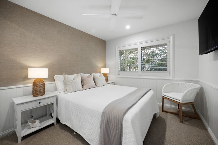 The stunning main bedroom features a king bed, a built-in wardrobe and the contemporary en-suite has a walk-in shower. The stand-out feature of the bedroom is the balcony overlooking Noosa River offering panoramic views. The second bedroom has a Queen bed with wall mounted TV. The third bedroom has 2 singles with a wall mounted TV.