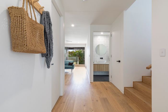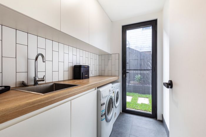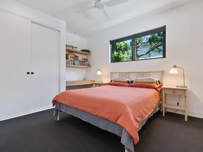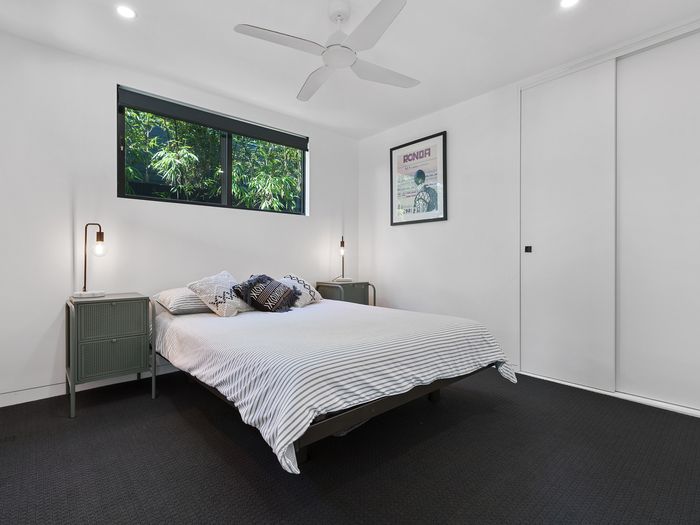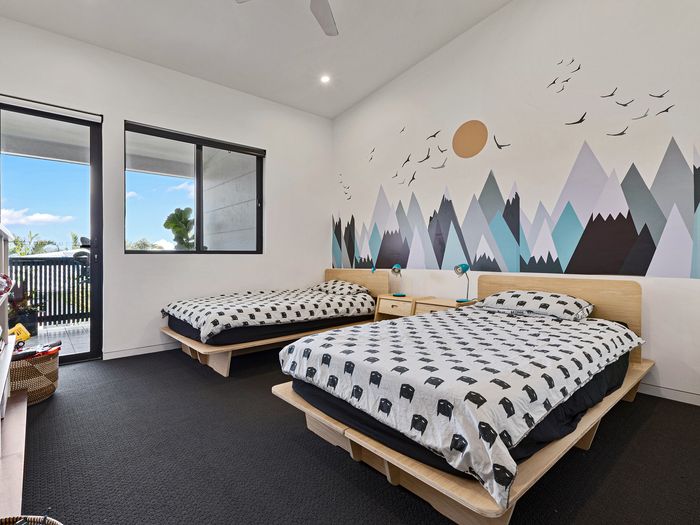 The ground floor has 3 bedrooms, 2 with Queens and the 3rd with a king single bunk bed, a modern bathroom with shower and toilet, laundry and a living/media room. Off the living area and through glass sliding doors, step out onto the large covered deck into the backyard bordering with lush gardens, it truly is a private oasis. With outdoor seating, swimming pool with waterfall feature and a trampoline for the kids – both big and little!