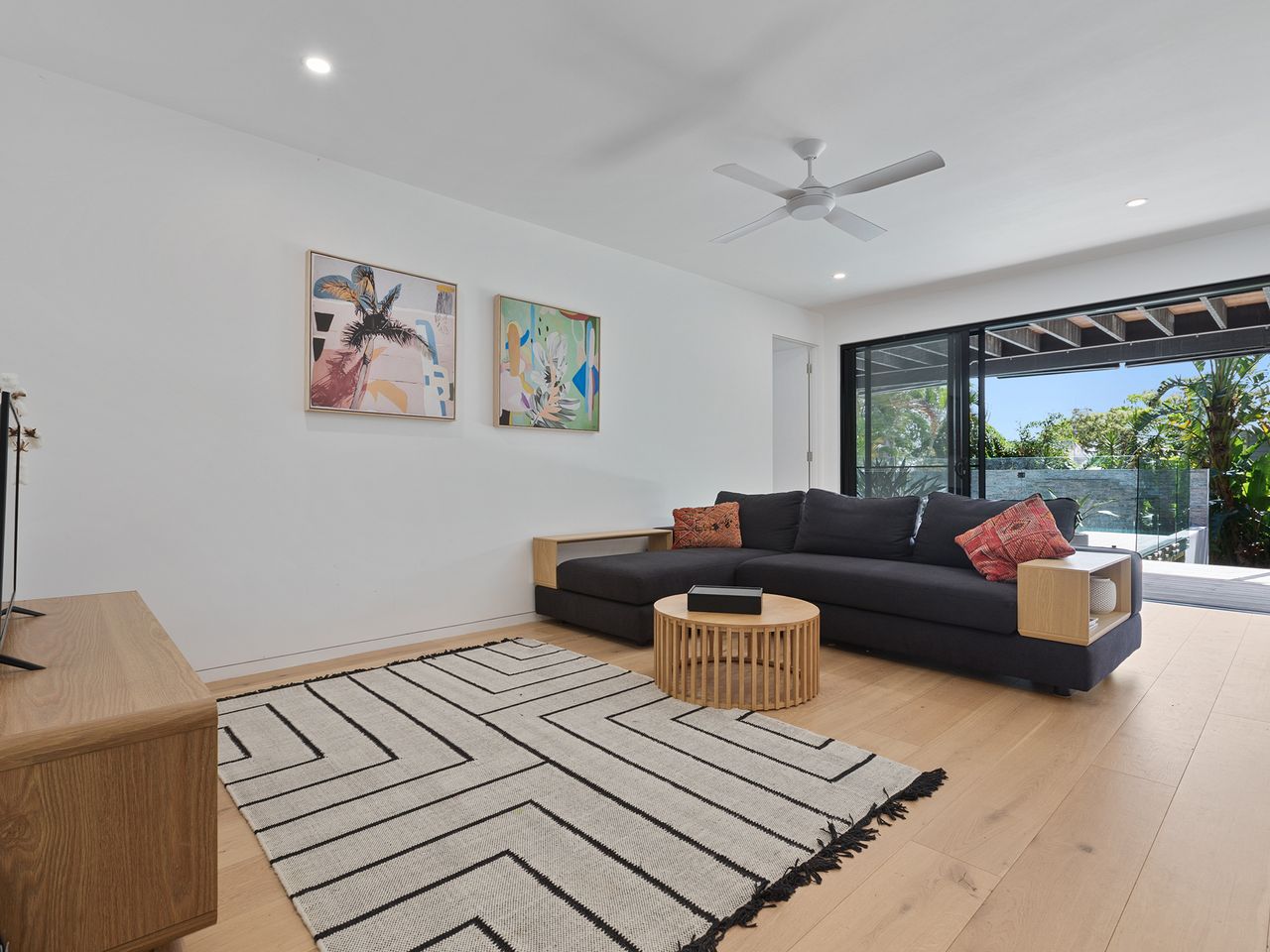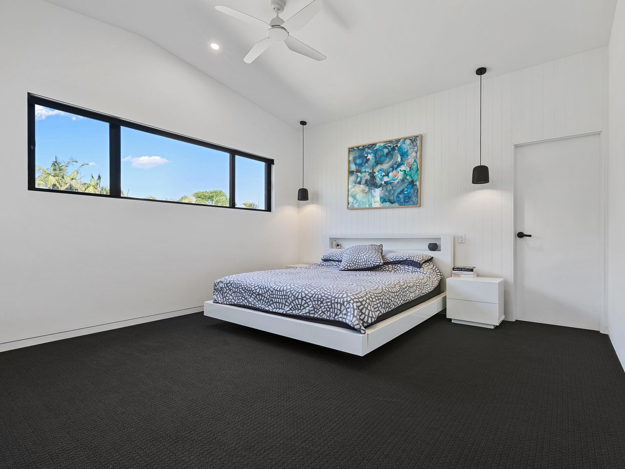 The ground floor has 3 bedrooms, 2 with Queens and the 3rd with a king single bunk bed, a modern bathroom with shower and toilet, laundry and a living/media room. Off the living area and through glass sliding doors, step out onto the large covered deck into the backyard bordering with lush gardens, it truly is a private oasis. With outdoor seating, swimming pool with waterfall feature and a trampoline for the kids – both big and little!