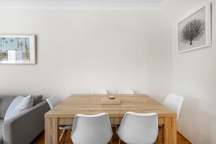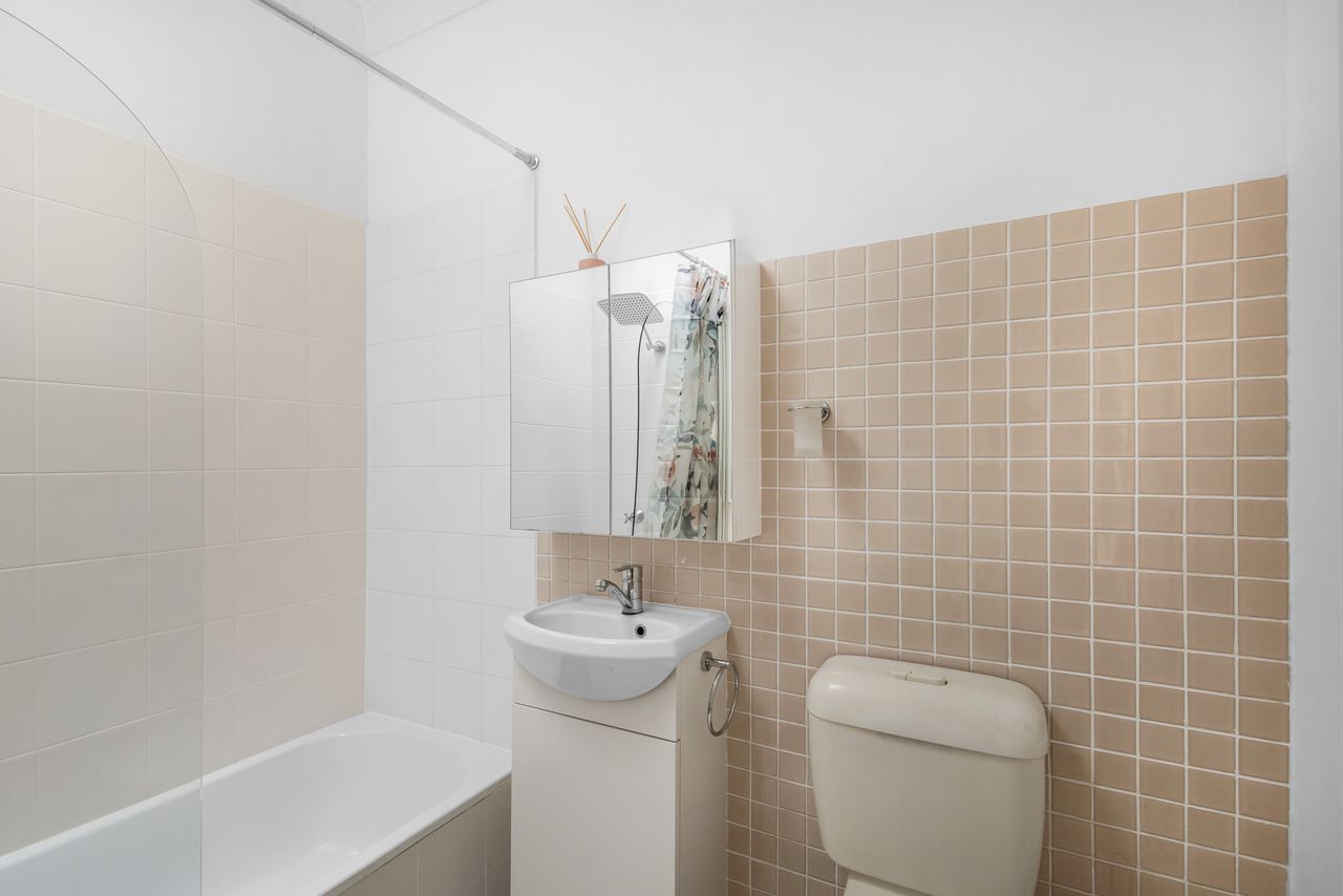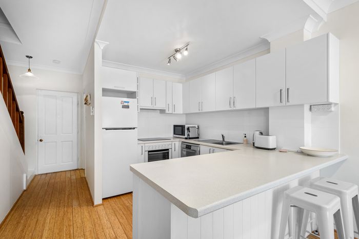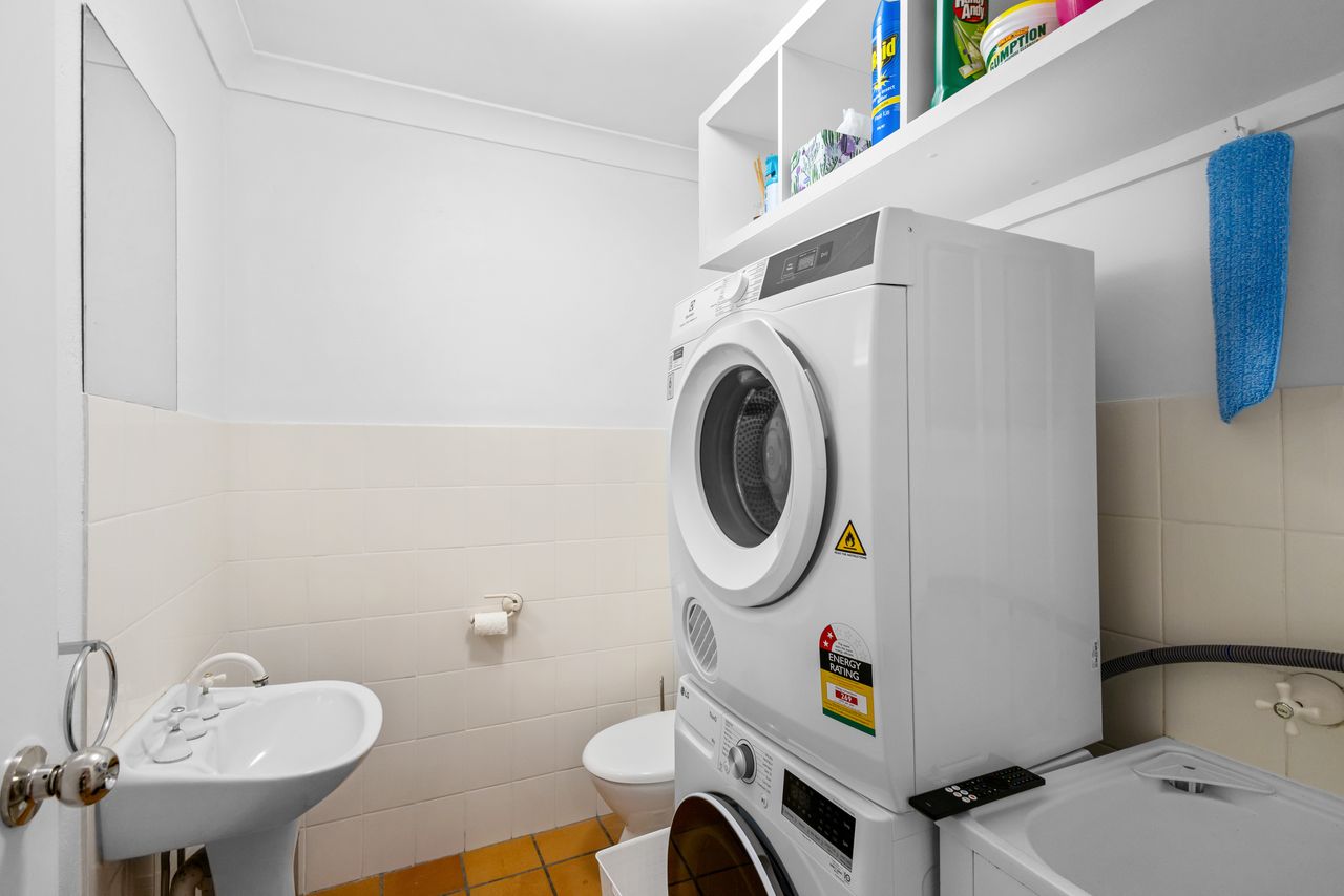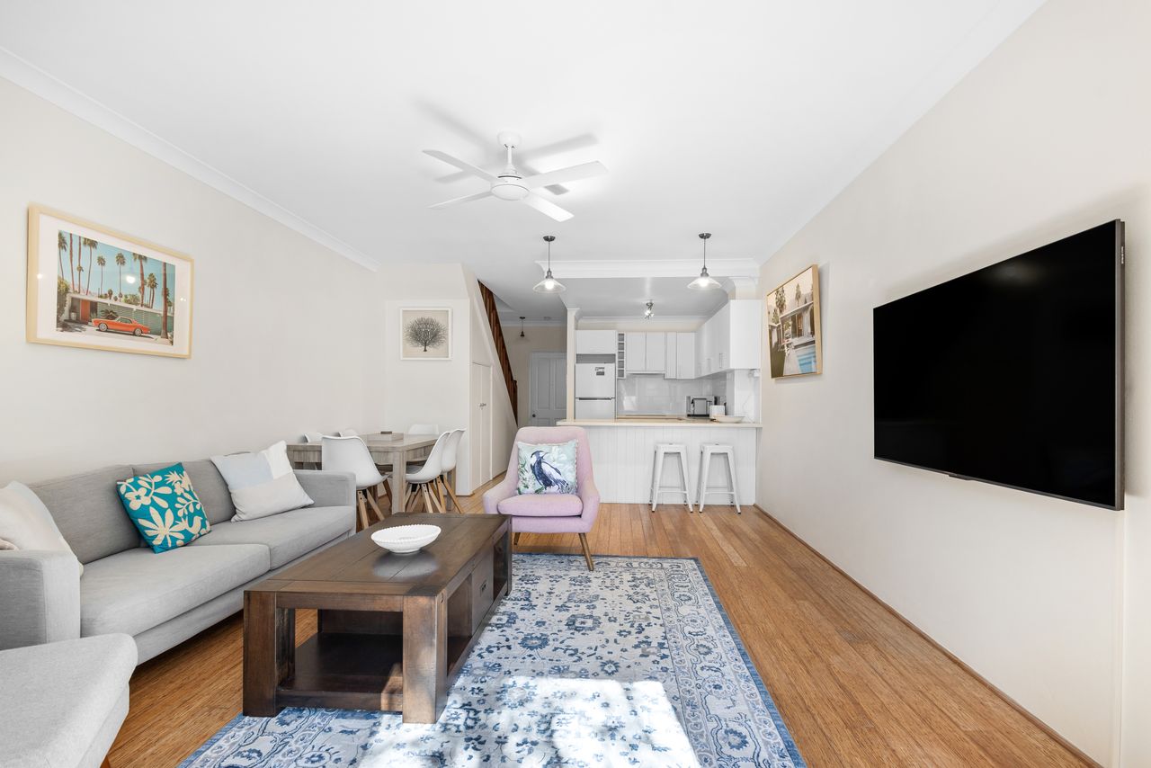 Upstairs, two generous bedrooms provide restful sanctuaries, with the master bedroom enjoying access to a covered balcony that overlooks the leafy north-facing courtyard. The shared bathroom is thoughtfully positioned between both bedrooms, and a downstairs powder room adds extra convenience.